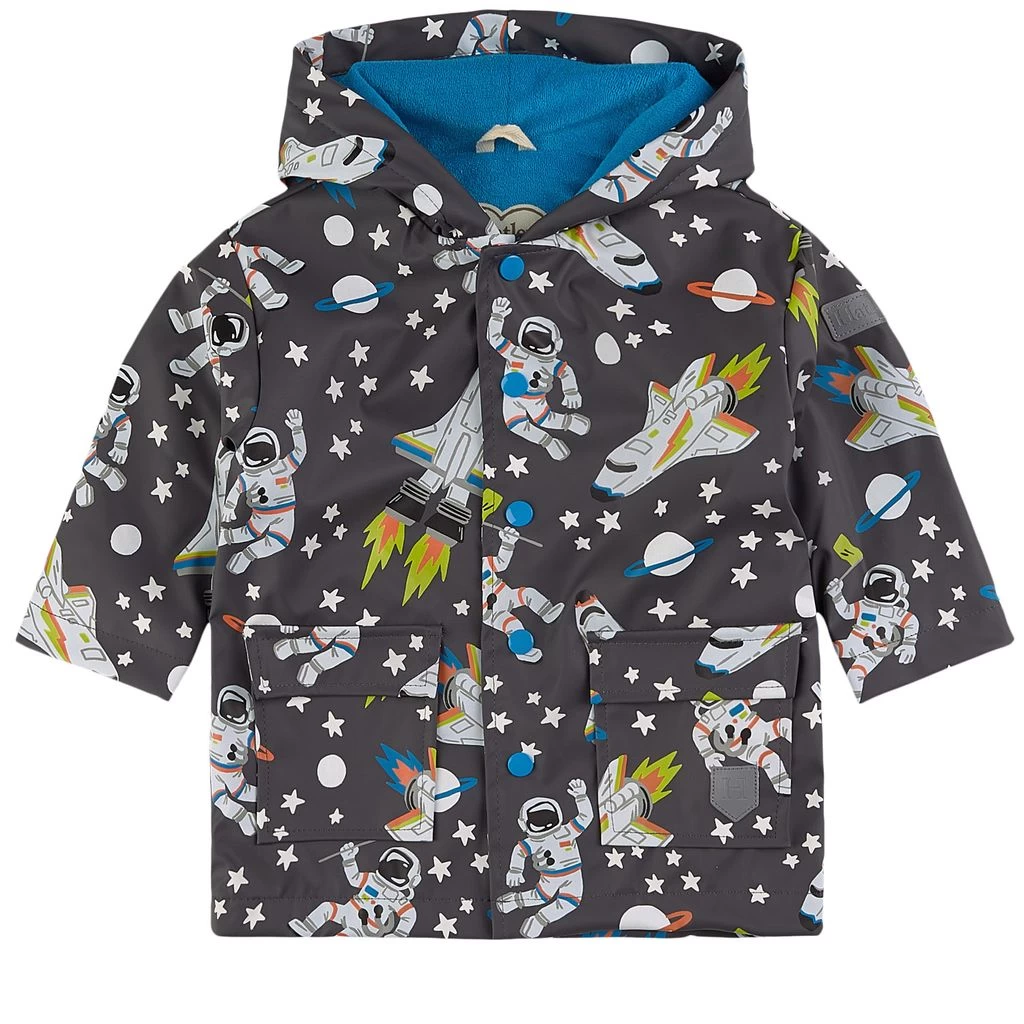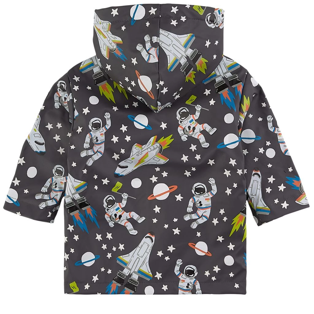 Rainy days will be so much fun. Dark grey raincoat by Hatley. The jacket has terry lining. It has a fixed hood, snap buttons at the front and two front pockets.