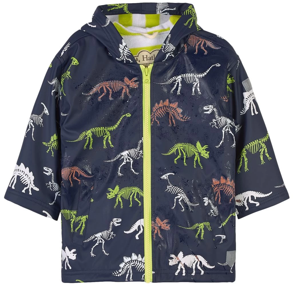 Navy Dino Fossils Print Color Changing rain jacket by Hatley. The jacket has a terry fleece lining. It has a fixed hood, a zip closure at the front and two front pockets.