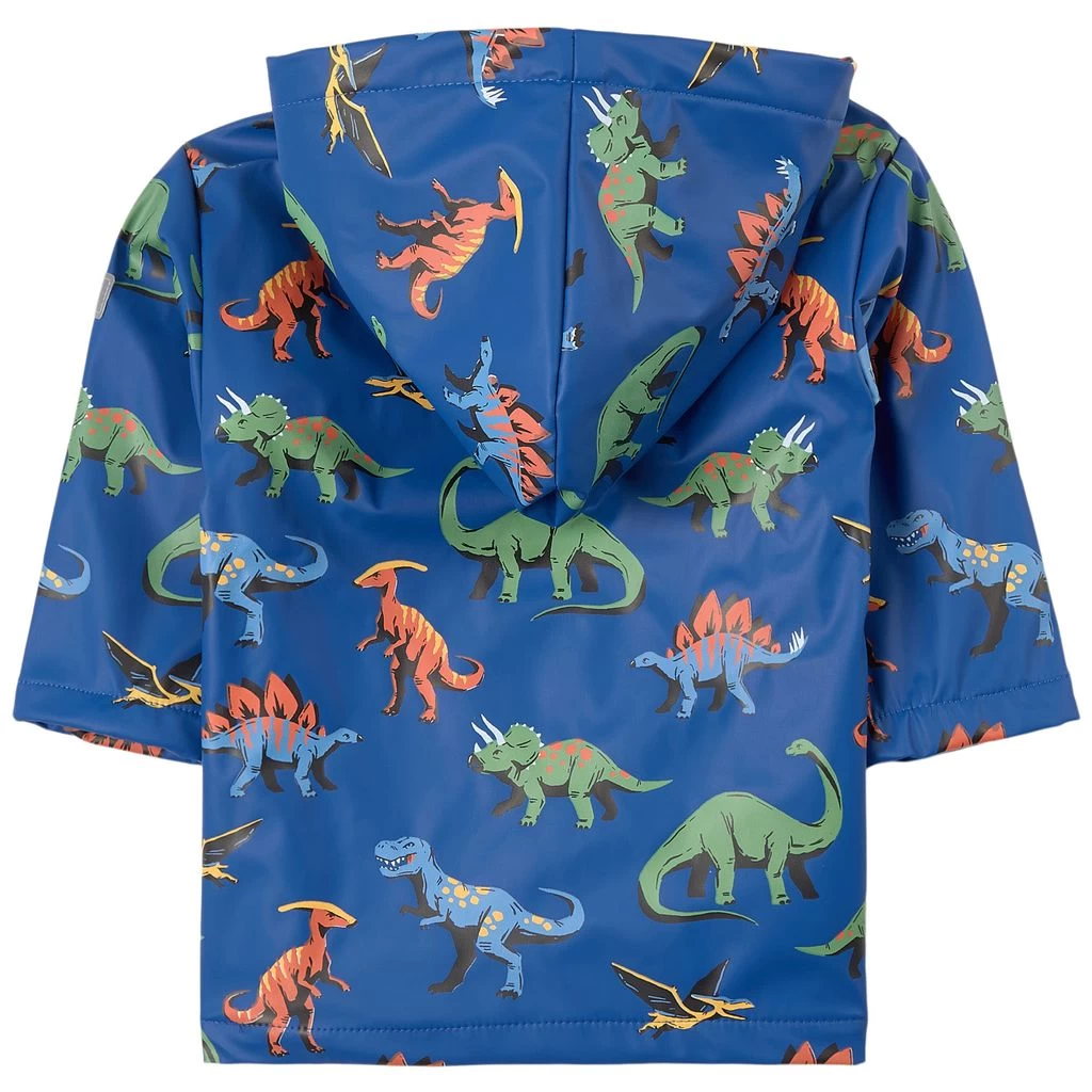 Blue Friendly Dinosaur Print raincoat by Hatley. The jacket has a terry fleece lining. It has a snap button closure at the front, two front pockets, a reflective logo at the front and at the sleeve and a fixed hood.