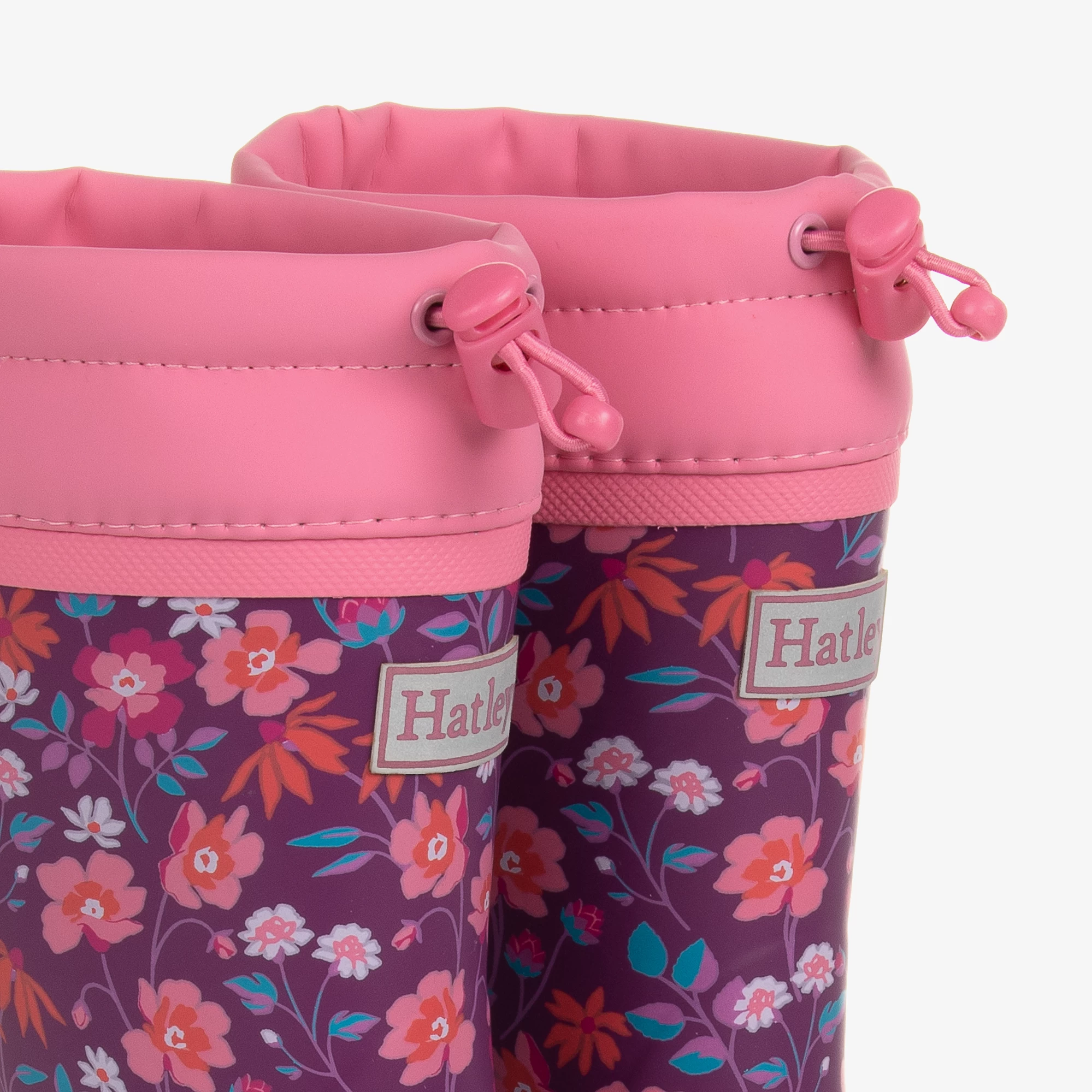 Pretty purple and pink rain boots for girls by Hatley, patterned in sweet wild flowers. Lined in cosy fleece for comfort, they have a puffer trim around the top with a toggle pull fastening to help keep out the rain. Made from flexible rubber, these practical boots have a reflective logo on the front for improved visibility and a cushioned insole. The chunky rubber soles improve grip for days spent splashing in puddles. They come with a pair of matching cotton ankle socks.