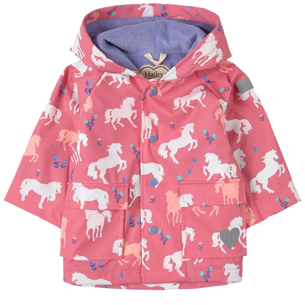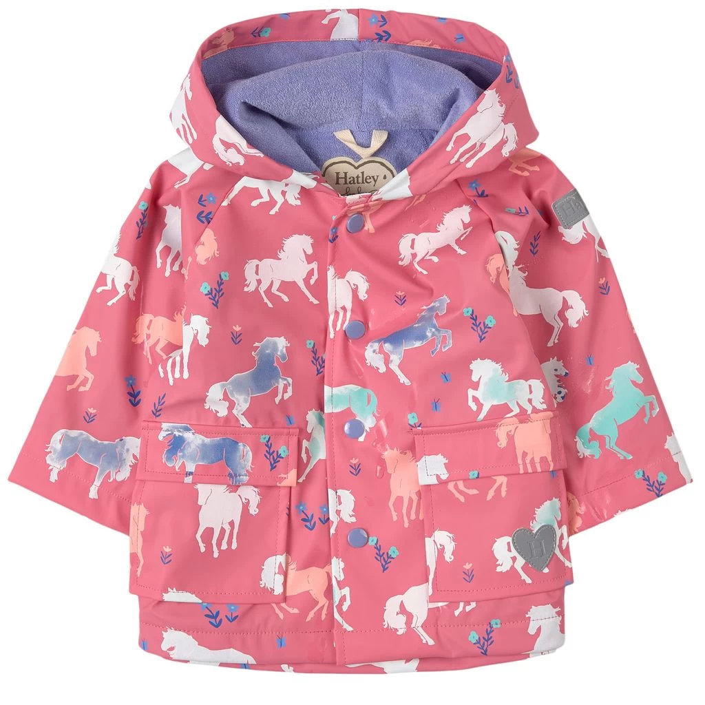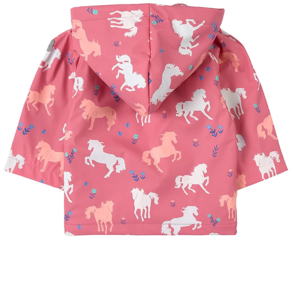 Pink Painted Pasture Print Color Changing Raincoat raincoat by Hatley. The jacket has a terry fleece lining. It has a fixed hood, a snap button closure at the front and two front pockets.