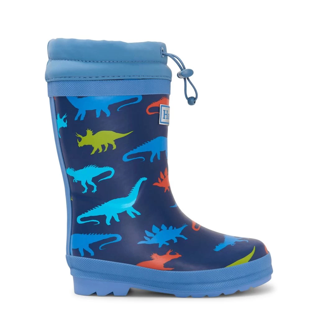 Navy rain boots by Hatley. The boots have a rubber upper. They have cosy sherpa lining, an elasticated cinch cord at the top, a removable insole and soles with rough tread for a sure step.
