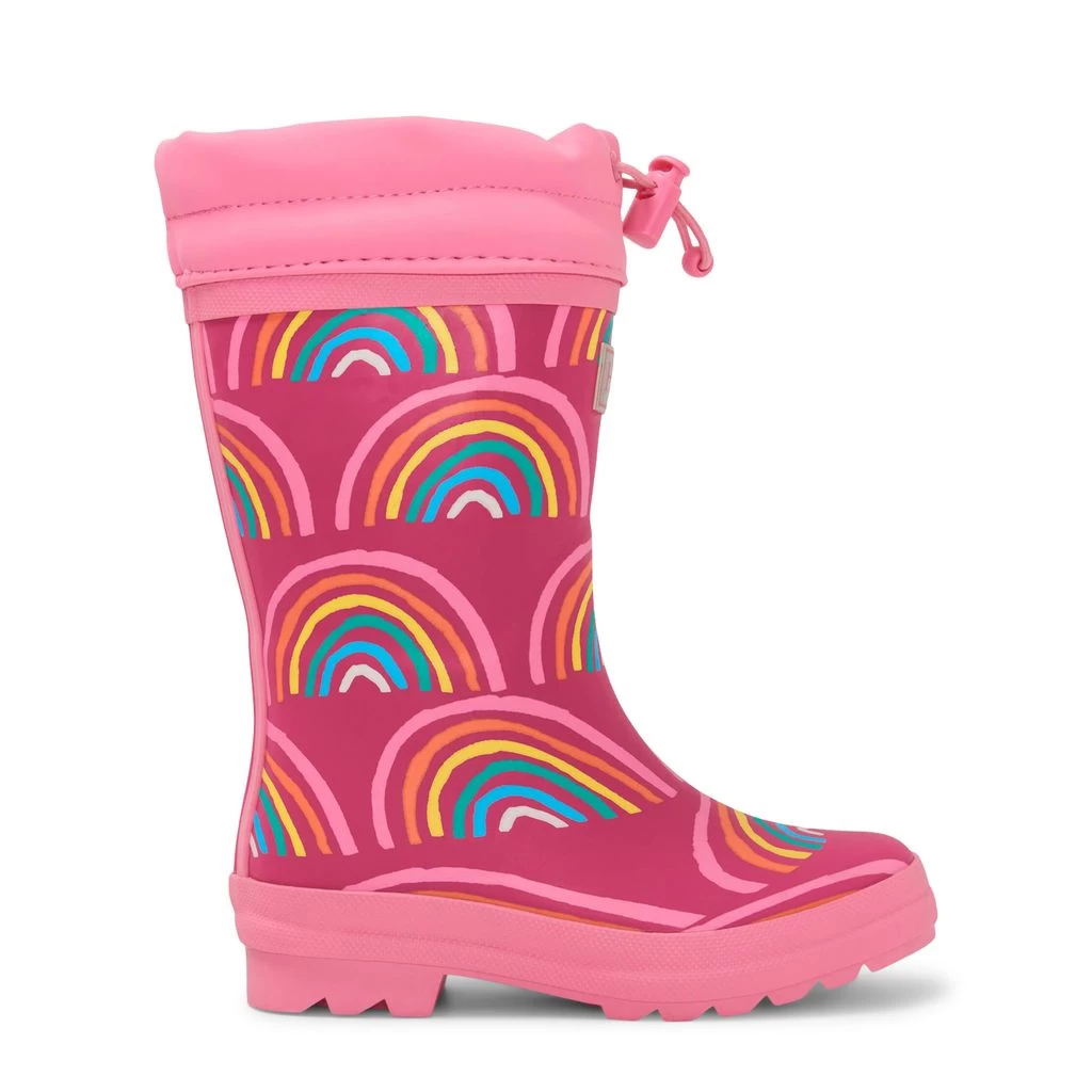 Pink rain boots by Hatley. The boots have a rubber upper. They have cosy sherpa lining, an elasticated cinch cord at the top, a removable insole and soles with rough tread for a sure step.