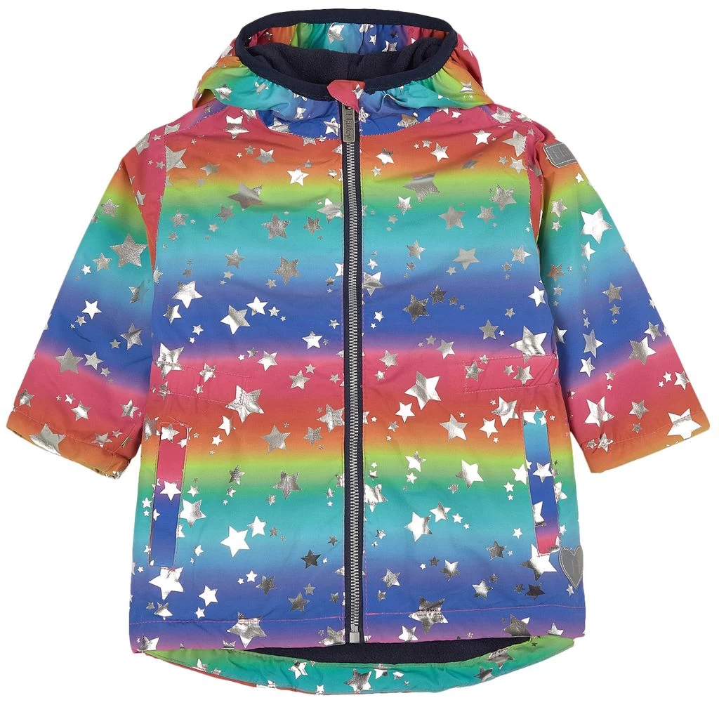 Rainy days will be so much fun. Multicolor raincoat by Hatley. The jacket has a star shaped all-over print. It has a soft fleece lining, a fixed hood, a zip closure at the front, an elasticated waist and two front pockets.